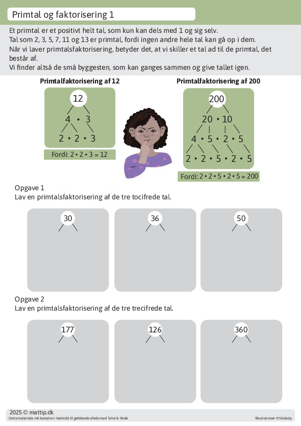 Materiale om primtal, faktorisering, definition, eksempler samt opgaver. Viser trædiagram ved 12, 200. Indeholder beregninger med 30, 36, 50, 177, 126, 360. Anviser fremgangsmåde som identificerer tal uden delere gennem tabel fra 2 til 100 via markeringer frem mod 7-tabellen.