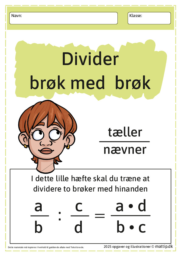 Materiale med forklaringer; opgaver til brøkdivision. Indeholder formel, eksempler samt fire øvelsessider.