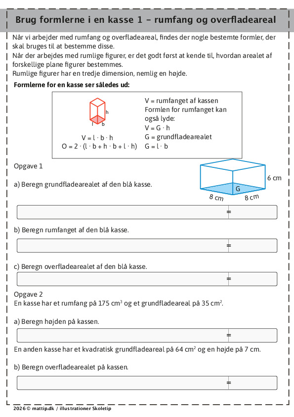 Arbejdsark formelsamling beregning rumfang, overflade, grundfladeareal, volumen samt højde ud fra givne dimensioner; indeholder eksempler opgaver relateret til rektangulær eller kvadratisk grundflade
