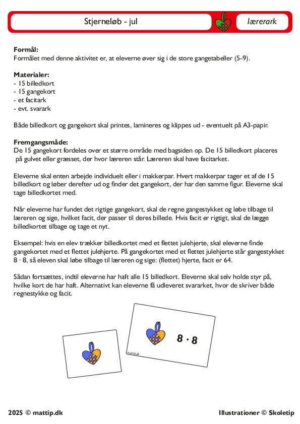 Undervisningsmateriale til stjerneløb med juletema, hvor elever træner gangetabellerne 5-9. Indhold: 15 billedkort, 15 gangekort, facitark samt valgfrit svarark. Kort printes, lamineres og klippes. Deltagere finder match mellem motiv og regnestykke, beregner produkt og melder facit til lærer.