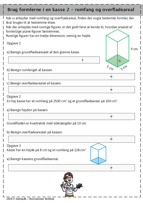 Arbejdsark med opgaver om grundfladeareal rumfang og overfladeareal af kasser med angivne dimensioner.