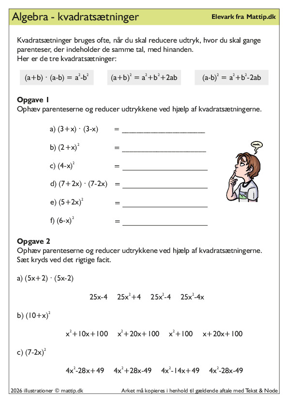 Øvelsesark om kvadratsætninger reduktion af algebraiske udtryk præsenterer tre identiteter inkluderer opgaver ophævning parenteser multiplechoice valg